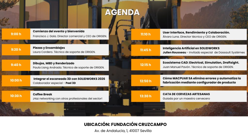 ![]() ORIGEN presenta las novedades de SOLIDWORKS 2026 Descubre las últimas innovaciones de SOLIDWORKS 2026 y conoce de primera mano las nuevas funcionalidades que te ayudarán a mejorar la productividad, la colaboración y la eficiencia de tus proyectos. Este año contaremos con la participación de MP Ascensores, una de las empresas líderes en el sector de la elevación, que compartirá su experiencia real aplicando DRIVEWORKS en el desarrollo de sus productos. También nos acompañarán colaboradores como Peel 3D, que mostrarán cómo integrar el escaneado 3D con SOLIDWORKS 2026 para optimizar procesos de diseño. Además, un invitado especial de Dassault Systèmes nos hablará sobre el papel de la Inteligencia Artificial en SOLIDWORKS. Para cerrar la jornada, disfrutaremos de una cata de cervezas artesanas guiada por un maestro cervecero. ![]() |
